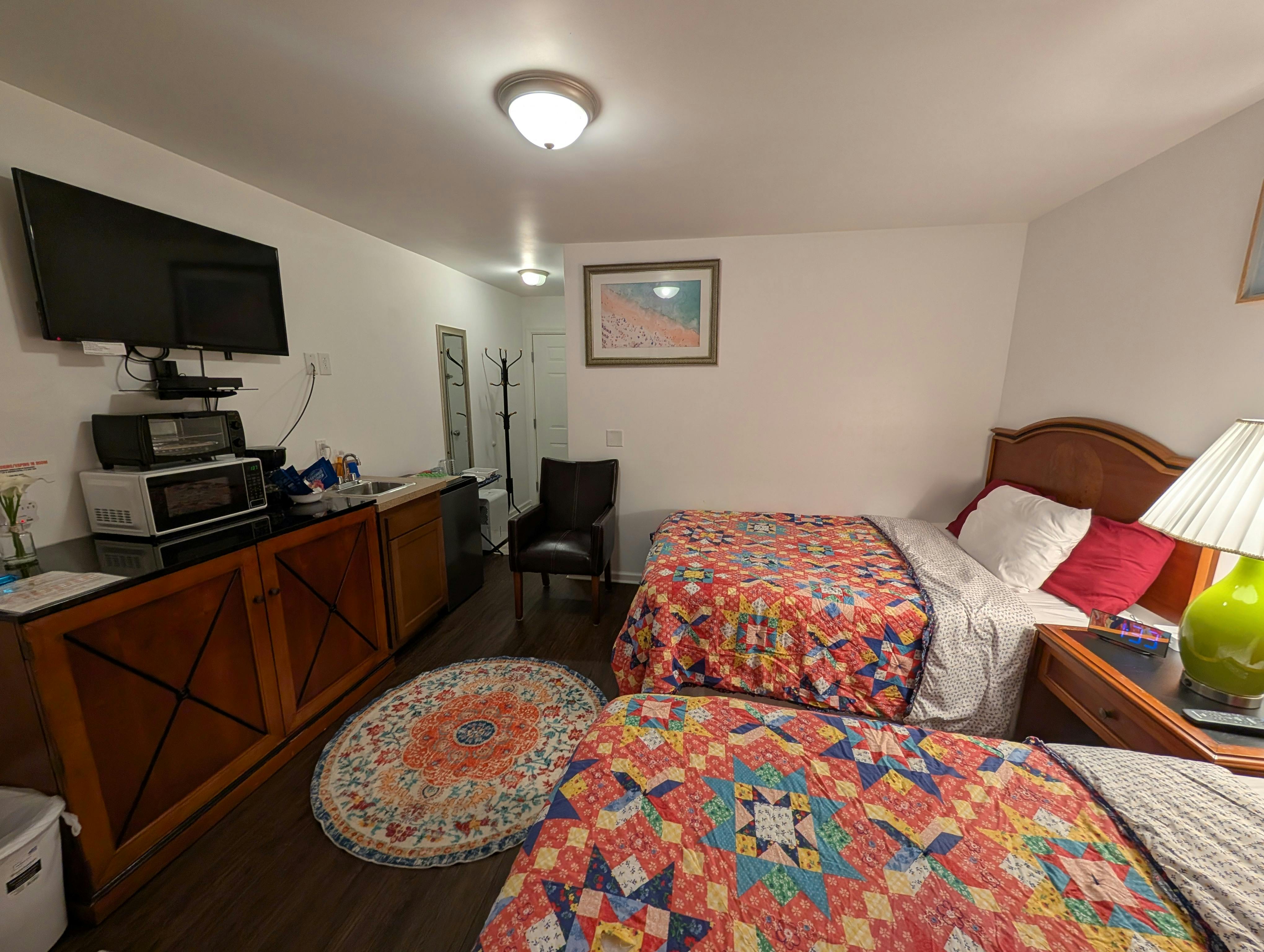 Our smaller yet charming room offers two full-size beds, perfect for a comfortable and restful stay. Though compact, this room is equipped with all the amenities you need for a relaxing experience.